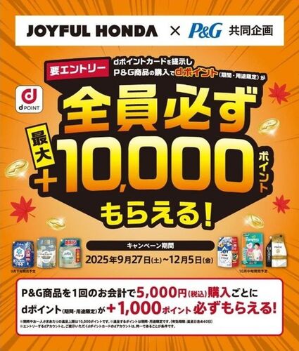期間中にエントリーした上で、ジョイフル本田やジョイホンの店頭でdポイントカードを提示して花王の対象商品を1回税込5,000円購入毎にdポイント1,000ポイント貰える! 還元上限は期間中10,000ポイントまで。 dポイント利用分についてもキャンペーン対象です。