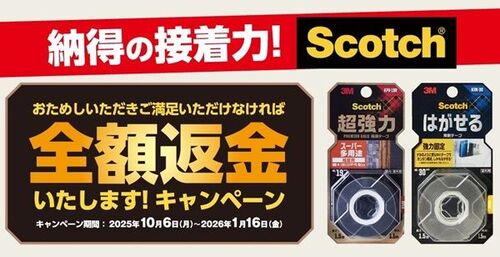 期間中に、Scotch(スコッチ)の対象の両面テープ製品を購入し、使用した上で満足できなければ対象商品1点まで全額返金! 申し込みは1世帯辺り1回まで。