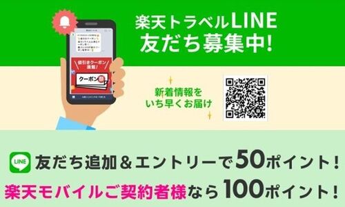 期間中に楽天トラベル公式LINEアカウントを友だち追加した上で、エントリーすると、50ポイント貰える! 楽天モバイルユーザーなら100ポイント貰える!