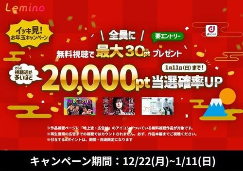 期間中にエントリーした上で、映像配信サービス「Lemino(レミノ)」内の「地上波・広告付」のアイコンがついている無料視聴作品の本編を週に1回以上3週連続※視聴すると、dポイントが30ポイント貰える!