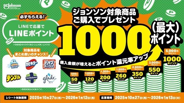 期間中にジョンソンの対象商品を税込500円以上購入したレシートを専用サイトにアップロードして応募すると、LINEポイントが最大1,000ポイント貰える!